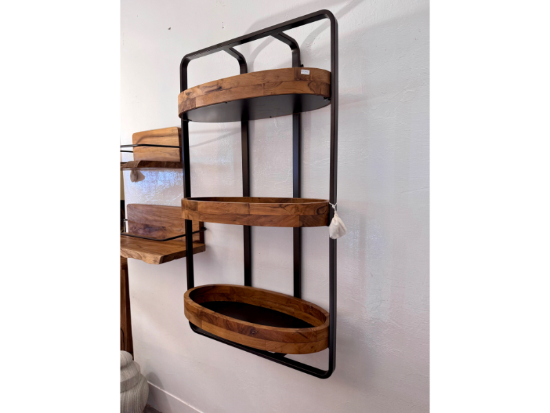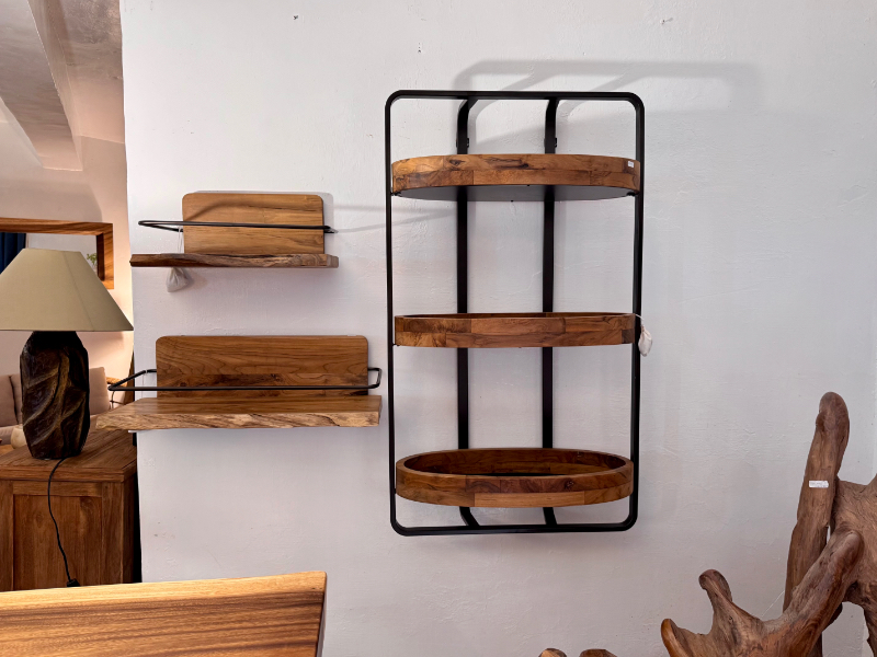 這款壁掛展示架選用優質老柚木製作,保留了原始溫潤的紋理與色澤,