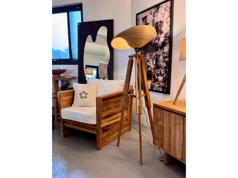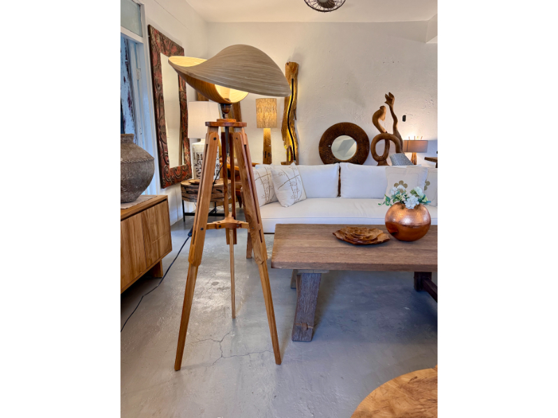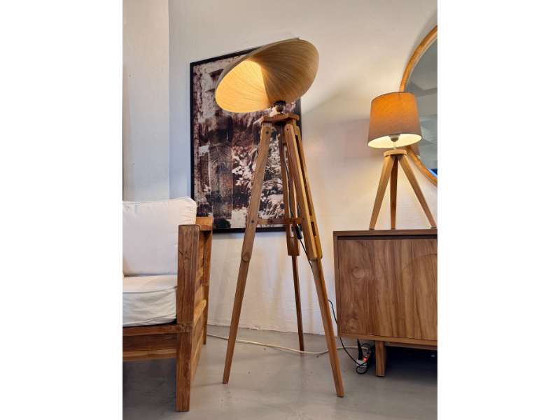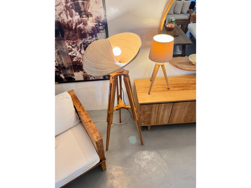Made with a teak stand and a laminated bamboo shade.
